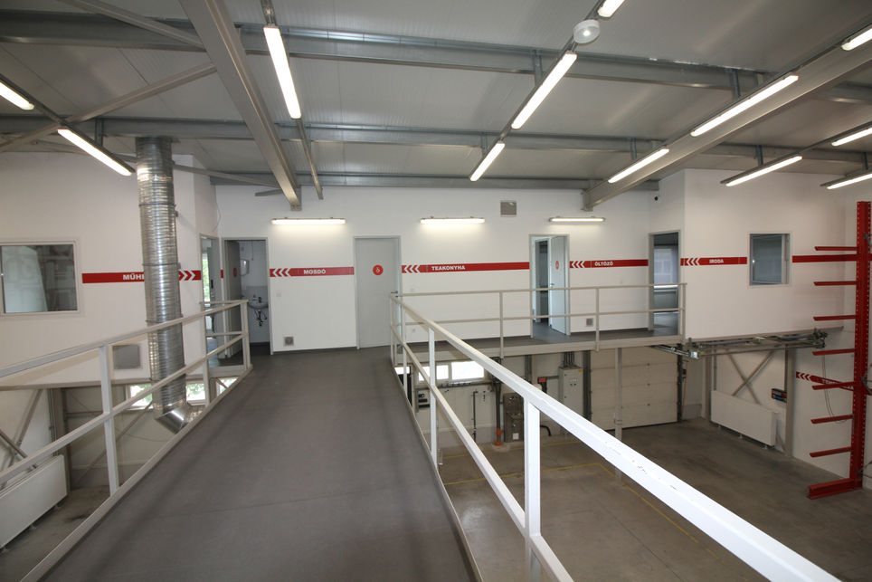A galéria területből 56nm-en iroda és szociális blokk került kialakításra, míg a fennmaradó terület 500kg/nm teherbírású targonca feladóval rendelkező rakodó galéria, amelyen további irodák is létesíthetőek.